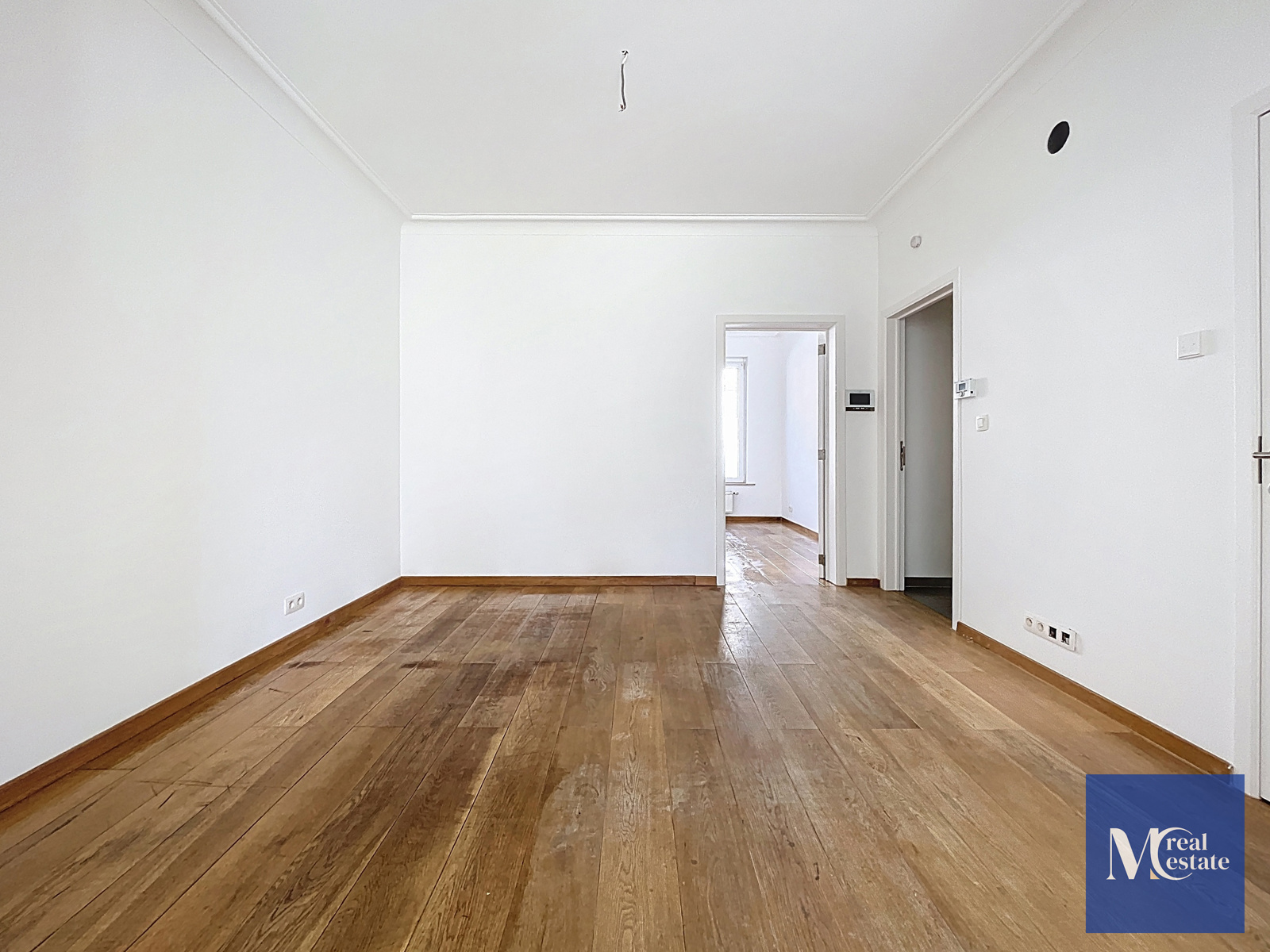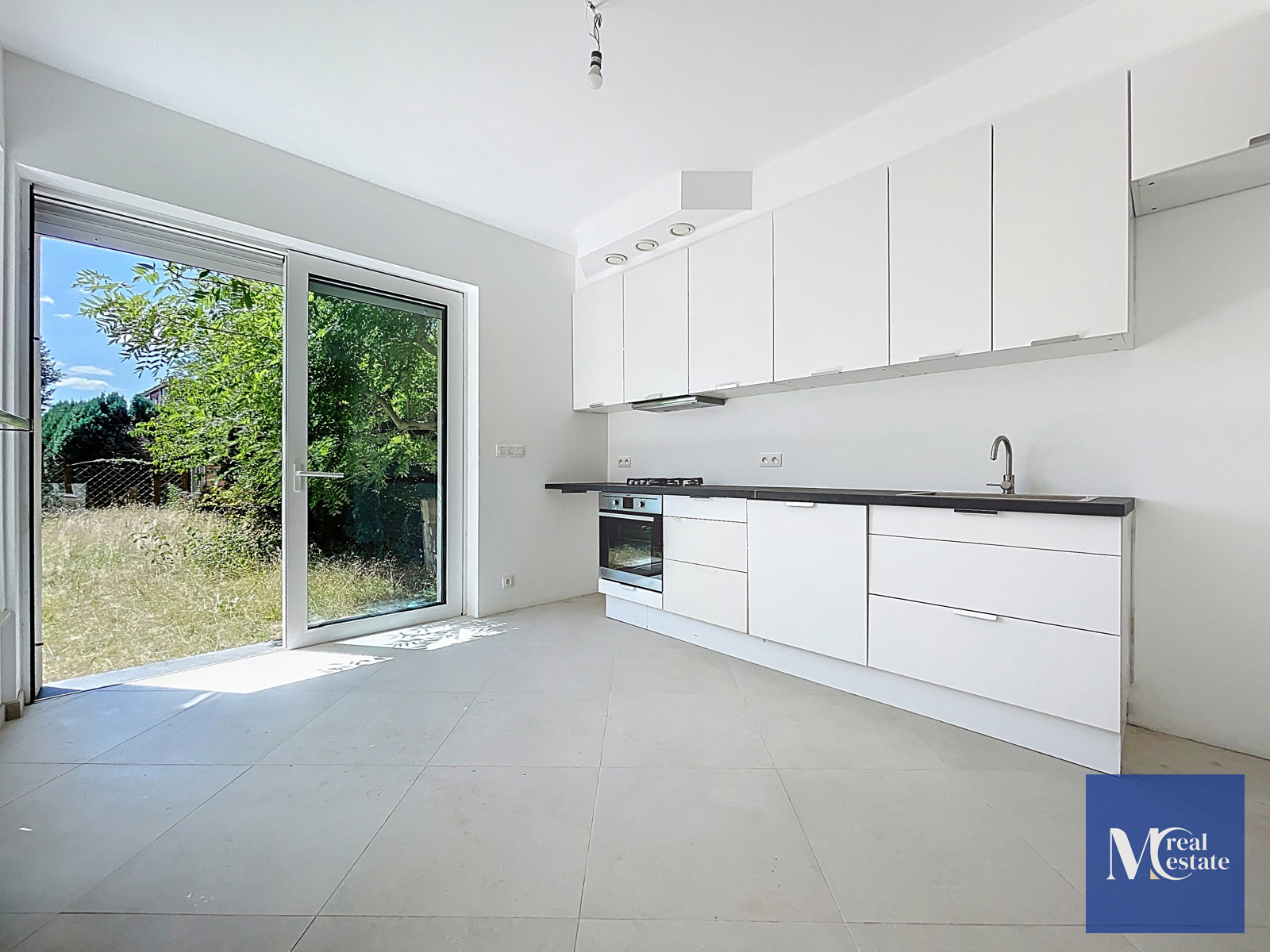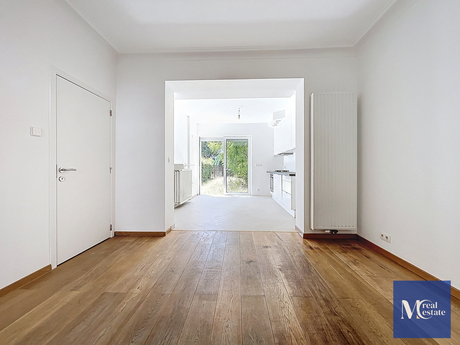 Saint-Vincent district close to transport (tram, bus and Bordet train station), shops, sports club and NATO; beautiful renovated apartment on the ground floor with a PEB C in a small co-ownership of 3 units with low charges. It consists of an entrance hall, separate toilet, living room of 14m2, american kitchen ½ equipped of 13m2 (oven, gas hob, extractor, dishwasher, fridge space and washing machine space), access to large South-West facing garden, 1 bedroom of 15m2, office of 8m2, bathroom (shower, bathtub, sink unit). A cellar. Double glazing throughout, videophone, double flow system, individual gas heating, compliant electricity. RU and plans available. Charges 25€/month. Information and visit 0478 35 73 88