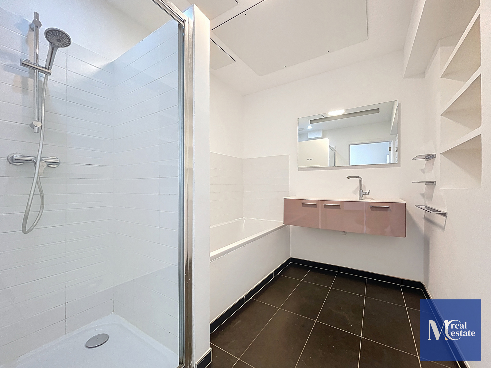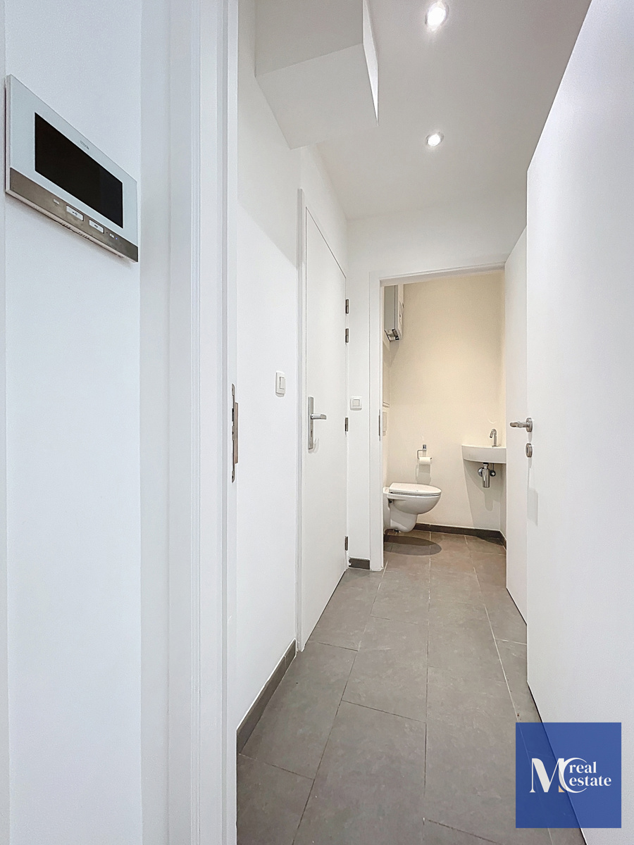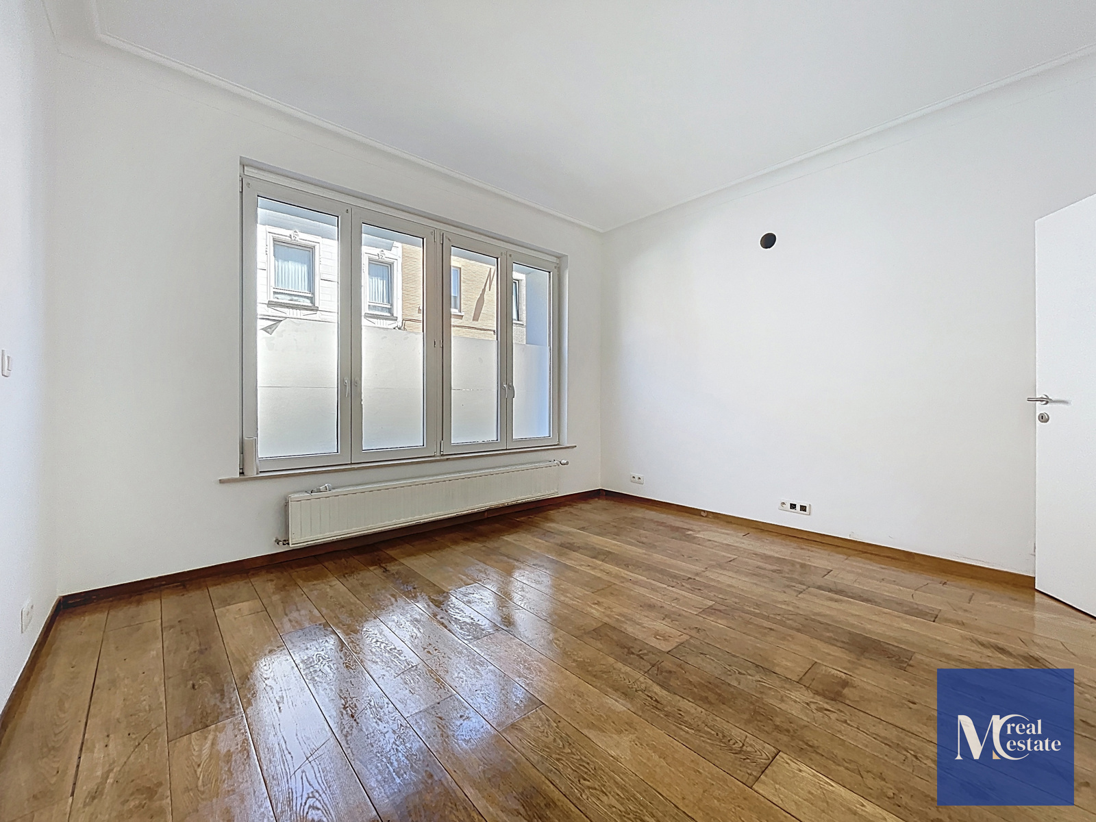 Saint-Vincent district close to transport (tram, bus and Bordet train station), shops, sports club and NATO; beautiful renovated apartment on the ground floor with a PEB C in a small co-ownership of 3 units with low charges. It consists of an entrance hall, separate toilet, living room of 14m2, american kitchen ½ equipped of 13m2 (oven, gas hob, extractor, dishwasher, fridge space and washing machine space), access to large South-West facing garden, 1 bedroom of 15m2, office of 8m2, bathroom (shower, bathtub, sink unit). A cellar. Double glazing throughout, videophone, double flow system, individual gas heating, compliant electricity. RU and plans available. Charges 25€/month. Information and visit 0478 35 73 88
